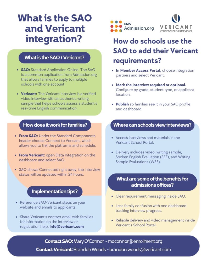 The SAO-Vericant integration allows students to link their Vericant interview account with their SAO (Standard Application Online) account so that interview progress can be shared between the two systems.