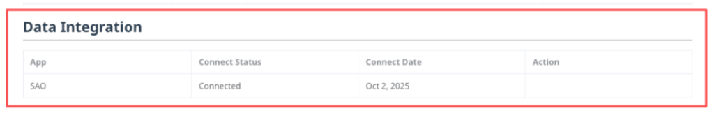 If you already have a Vericant account, you can connect from the Vericant dashboard. You will see a section called Data Integration with an SAO row.
